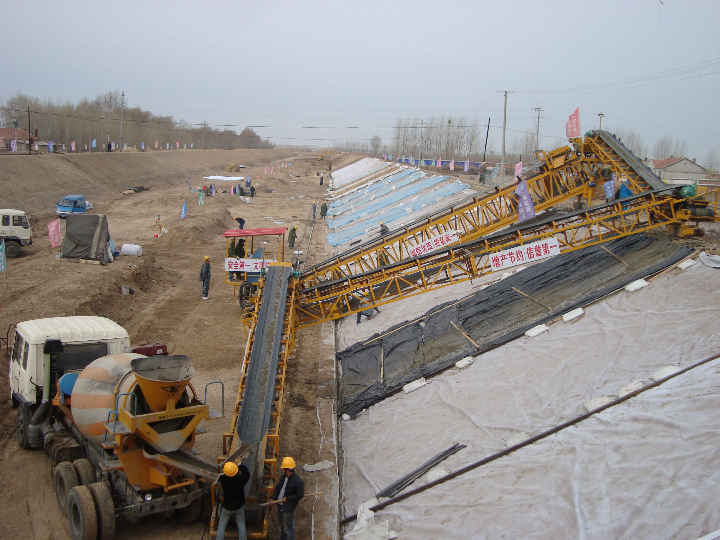 輸水總干渠坡面采用渠道襯砌機現(xiàn)澆8cm厚PP纖維混凝土板護砌,混凝土澆筑完成后采用機械切縫,切縫后混凝土板的規(guī)格1*1m,渠道橫縫和縱縫縫寬1cm。分縫填料上部采用聚硫密封膠(明渠專用),下部選用聚乙烯泡沫板填充?;炷涟鍓K下鋪一層復合土工膜(兩布一膜)進行防滲。為增加邊坡混凝土板的抗滑穩(wěn)定性,在坡腳設(shè)有現(xiàn)澆混凝土腳槽,腳槽底寬0.3m,頂寬0.5m,深0.5m。渠頂設(shè)有寬0.2m,高0.3m,長1m的現(xiàn)澆混凝土板塊封頂。